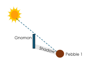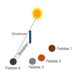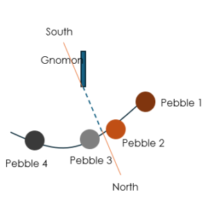 By tracing the curve that connects all the pebbles (or sticks) that have made it possible to identify the length of the shadow during the day, we locate the point closest to the gnomon. By definition, the time when the shadow was shortest is noon. Even if we didn’t have the chance to take a survey when it was precisely noon, the curve drawn allows us to extrapolate this point. On the line segment that connects this point of the curve to the gnomon, the gnomon gives the South and the point where the curve is closest to the gnomon corresponds to the North.